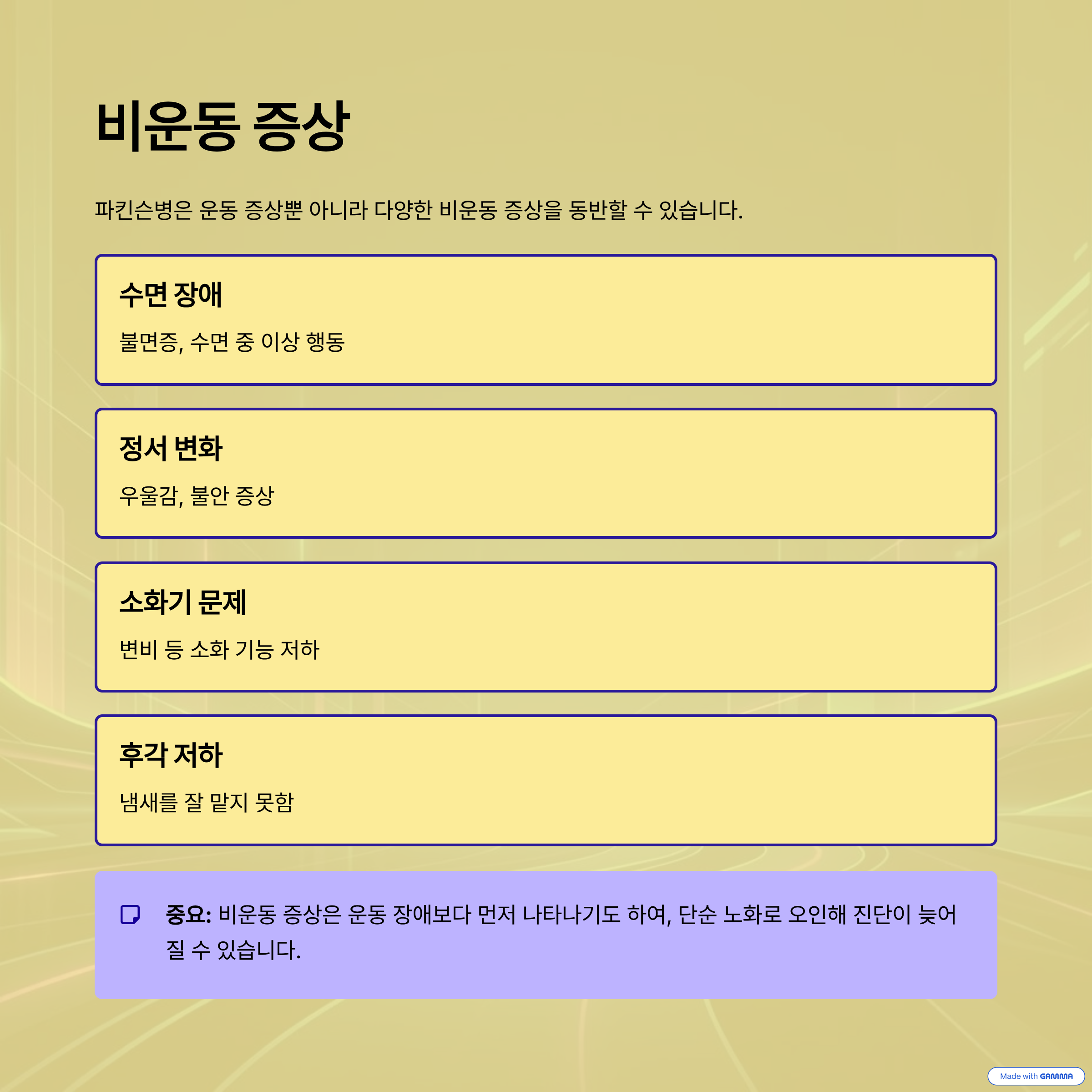 파킨슨병은 운동 증상뿐 아니라 다양한 비운동 증상을 동반할 수 있습니다. 대표적으로 수면 장애, 우울감, 불안, 변비, 후각 저하 등이 있으며, 이러한 증상은 운동 장애보다 먼저 나타나기도 합니다.